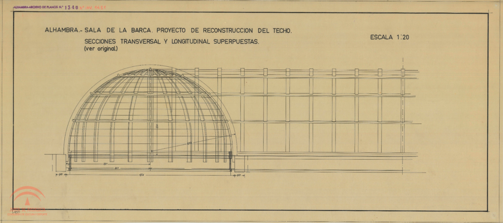 | Título: | Sala de la Barca. Proyecto de reconstrucción del techo. Sección transversal y longitudinal superpuestas |