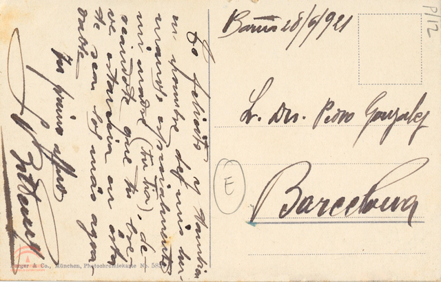 | Descripción: | B tarjeta postal coloreada de 138x89mm. Colores: verdes, marrones, azules, blancos y amarillos. En el reverso de la postal aparece un escrito: "Le felicito y tambien en nombre de mis hermanos especialmente mi madre (tu tia), deseándote que tu breve estancia en ésta te sea los más agradables. Tu primo Alfonso..." Fecha: Barna 28/6/921 Nombre: L.don. Pedro Gonzalez. Lugar: Barcelona Photochromiekarte No. 583? |