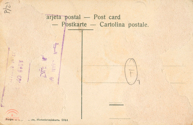 | Descripción: | B Tarjeta posta coloreada de 90x138mm. Colores: marrón, verde, blanco,azul, negro En el reverso de la postal aparece un matasellos donde se aprecia letra árabe, no se ve entero porque la primera capa del papel está arrancado o deteriorado. Photochromiekarte 5844 |