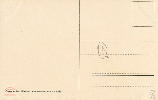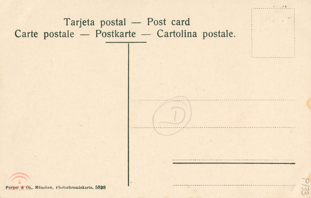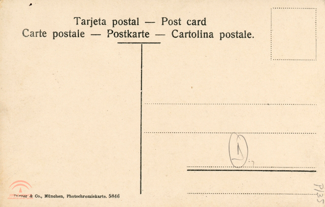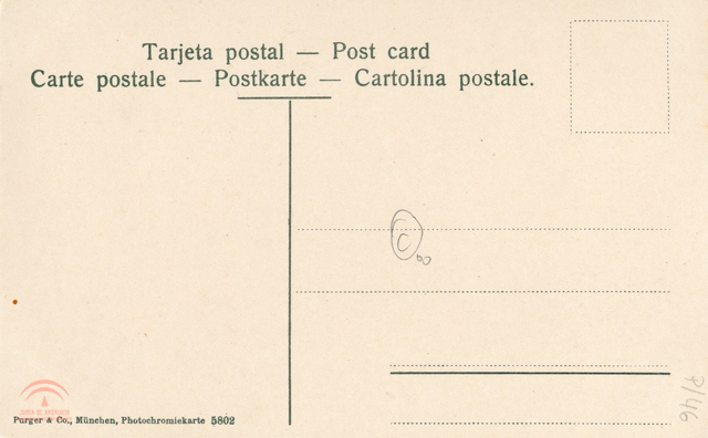 | Descripción: | B tarjeta postal coloreada de 138x89mm. Colores: amarillo, marrón, blanco, verde y azul. Photochromiekarte No.5820 |