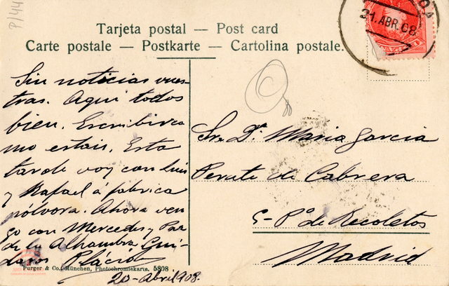 | Descripción: | B tarjeta postal coloreada de 138x89mm. Colores: rojo, azul, verde, marrón y gris. Texto en el reverso: " Sin noticias vuestras. Aquí todos bien.Escribiresmo estais. Esta tarde voy con Luis y Rafael á fabrica pólvora. Ahora vengo con Mercedes y Par a la Alhambra. Cuidaros. Plácido. 20-Abril-908." Enviada a : " Sra Dª Maria Garcia. Perati di Cabrera. Pº de Recoletos. Madrid." Sello color Salmón, de 10 cent tipo cadete en el que aparece Alfonso XII. Matasellos: Granada. 21.ABR.08 Photochromiekarte 5808 |