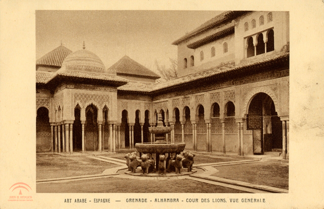 | Resumen: | En un primer plano aparece la fuente de los Leones con la construcción del segundo piso de la fuente, se caracteriza el agua que brota de la fuente. Detrás de ésta se observa el Templete con su cúpula coloreada que da acceso a la Sala de los Reyes. La disposición de la foto es vertical. |