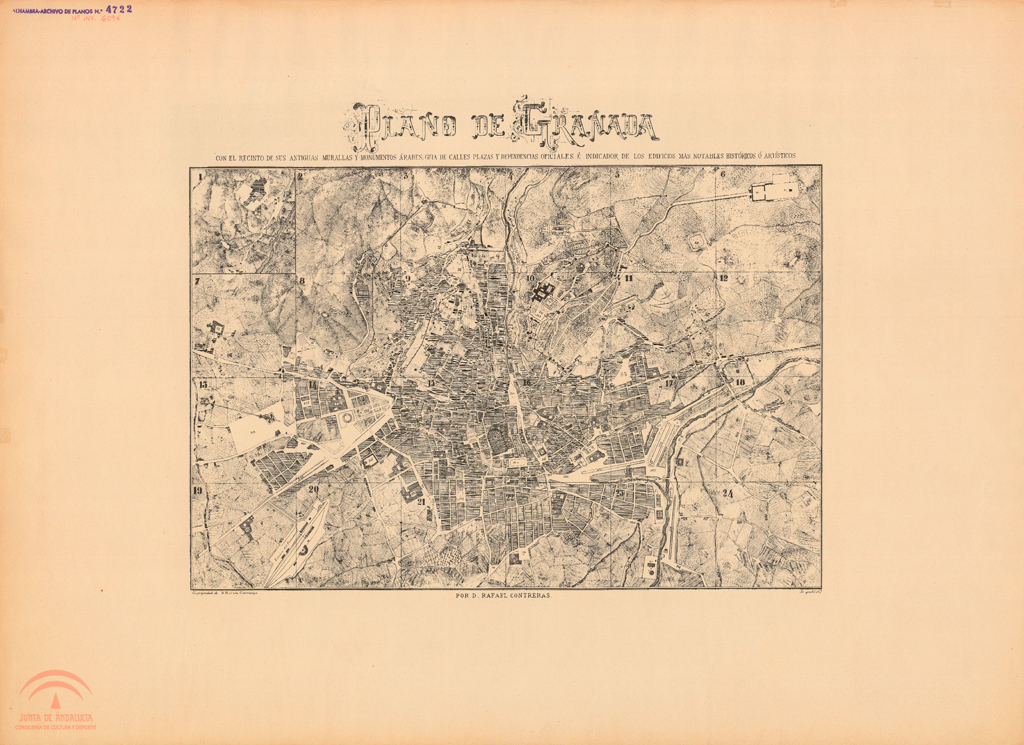| Descripción: | Copia, Papel, Grabado, 55 x 76 cm., s.e., 99 - 0 - 9 R. Contreras: "Lista alfabética de las calles, plazas y monumentos de Granada... ", Granada, Impr. I. Ventura, 1872. Numero de plano de la oficina técnica del servicio de conservación: 4721, El dibujo original se encuentra en el Archivo de la Real Academia de Bellas Artes de San Fernando (Madrid). Tableta de la escala original: 200 pies castellanos. 1 pie castellano equivale a 27'86 m. |