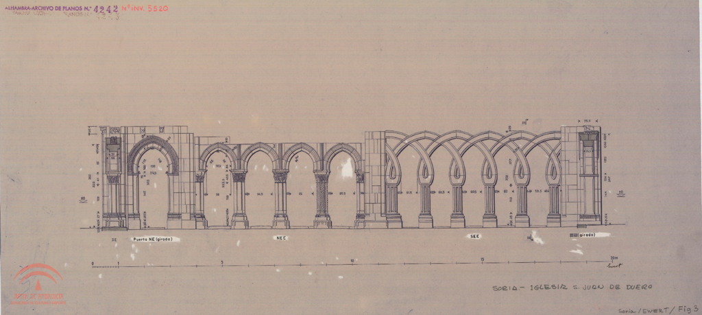 Copia con adiciones, Papel poliéster, Copiativo con adiciones a tinta, 25 x 54 cm., 1/50, 99 Christian Ewert:"Sistemas hispanoislámicos de arcos entrecruzados...", en "Cuadernos de la Alhambra", 10-11, 1974-75 Numero de plano de la oficina técnica del servicio de conservación: 4242, Con cotas |