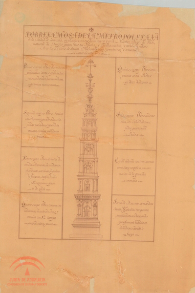 | Resumen: | Grabado de la torre diseñada por Diego de Siloé para la catedral de Granada, con leyendas explicativas rodeando la imagen |