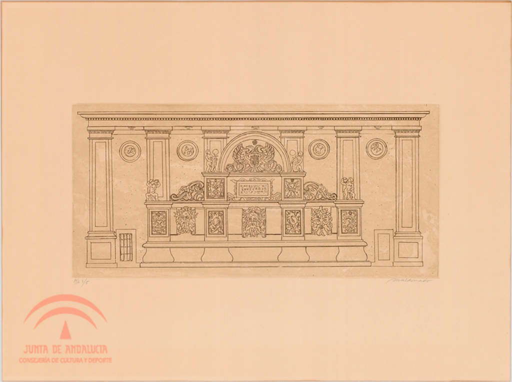 | Resumen: | Vista frontal del pilar de Carlos V en la Alhambra, de Manuel Maldonado. Obra gráfica original, probablemente perteneciente a la serie: "Testimonio y presencia en las casas de Granada", en el Taller de Grabado de la Fundación Rodríguez Acosta |