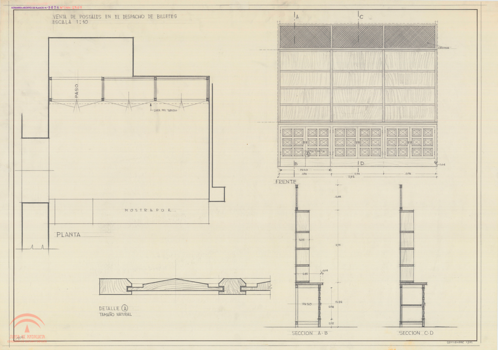 | Título: | Alhambra. Pabellón de Taquillas. Mueble-estantería para venta de postales. Planta, alzado, sección y detalle |