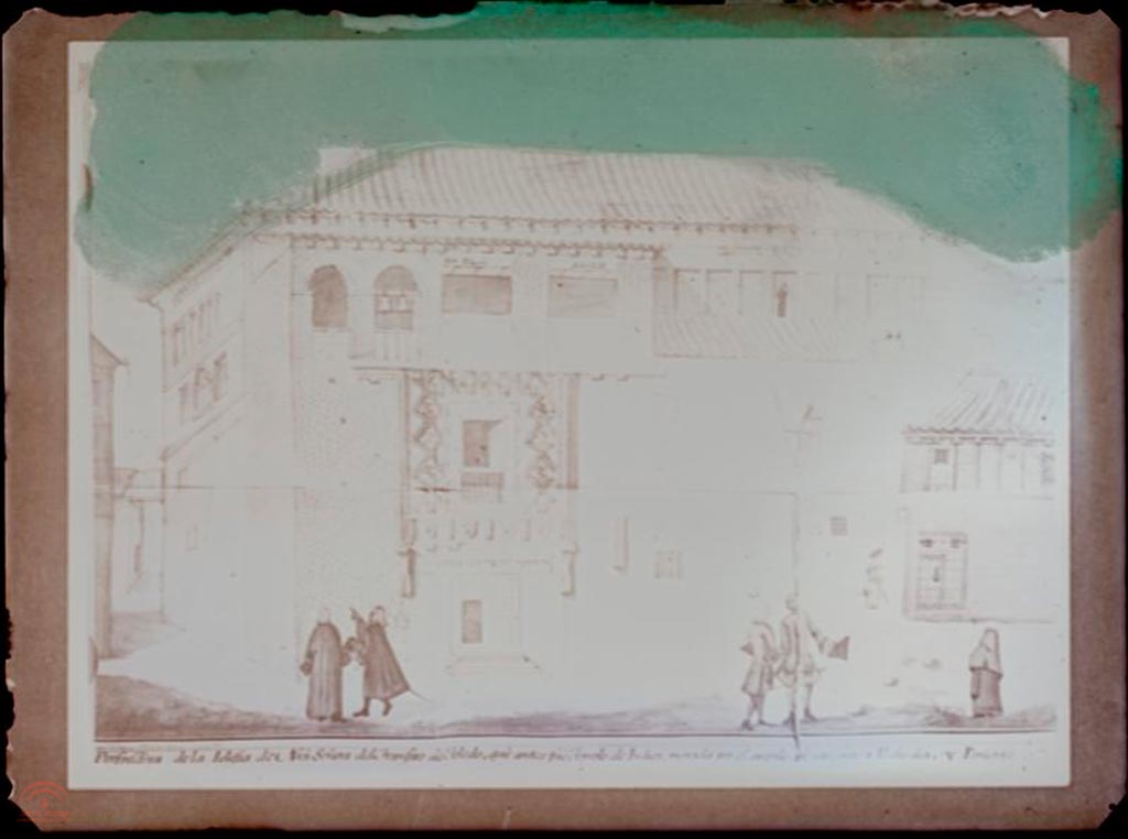 "Dibujo de ""Perspectiva de la Iglesia de Nuestra Señora del Tránsito, que antes fue templo de judíos, mirada por el ángulo de cae entre Mediodía y Poniente"". Gente en la calle con vestidos tradicionales, y inscripciones en hebreo en el templo."