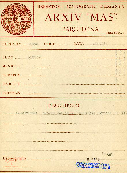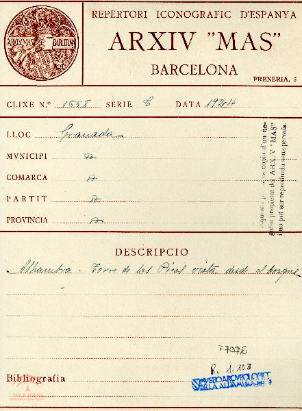 Montada sobre cartón con las medidas250 x 185 mm Aparece el nº de cliché 42636. Serie C Data 1924 y un sello de propiedad del "Arxiv MAS"1 positivo en b/n 240 x 180 mmSignatura antigua R.1059