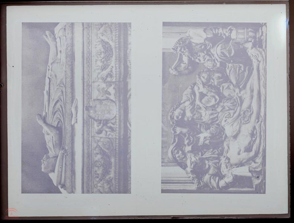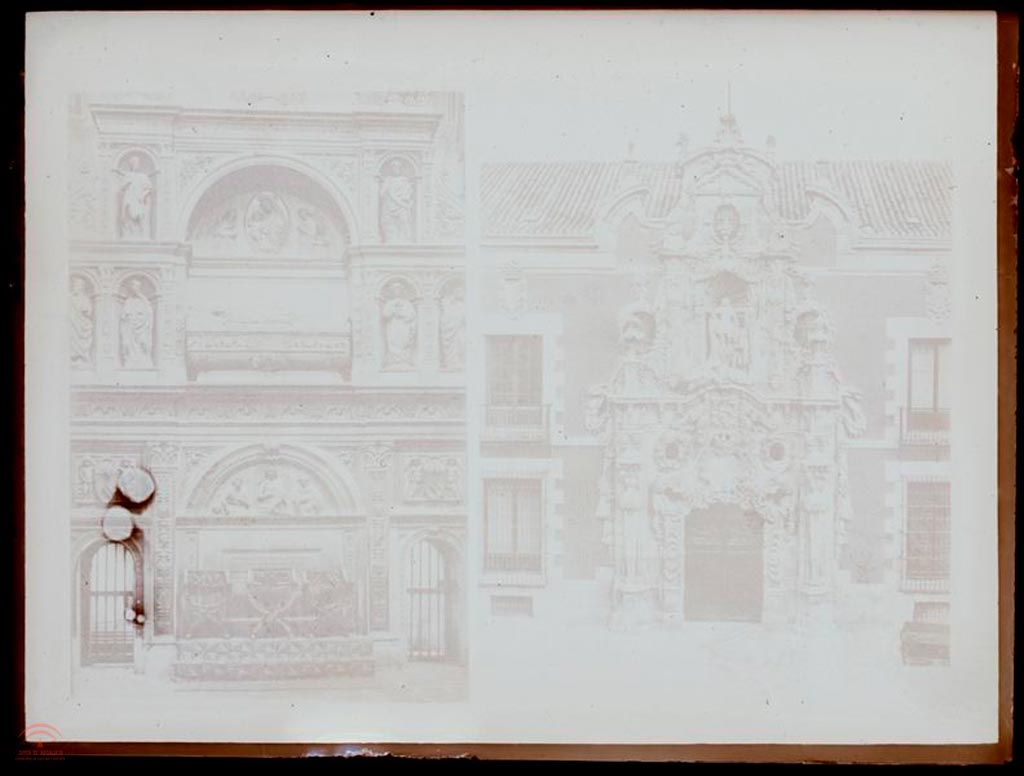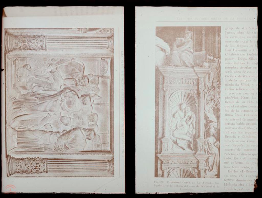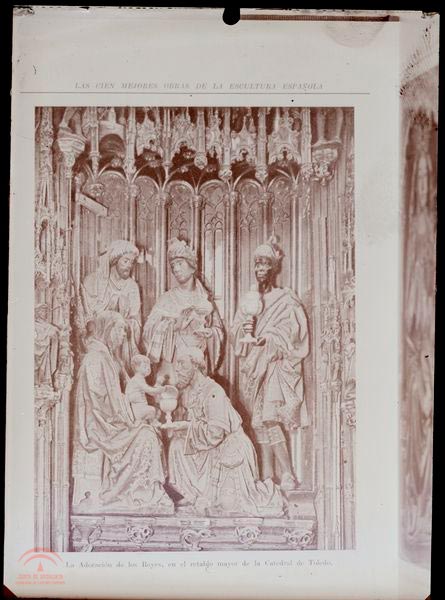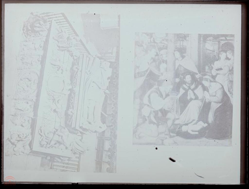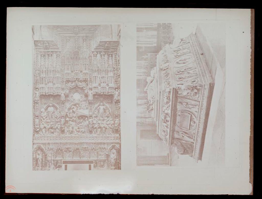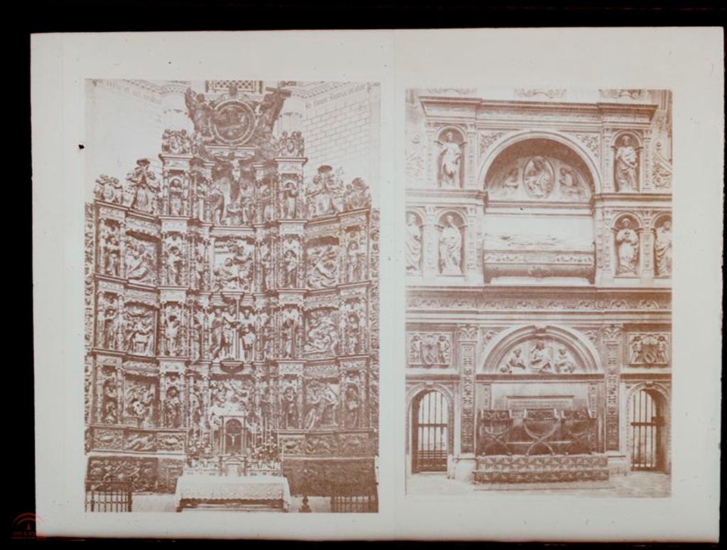 "Aparecen dos láminas-fotografías. Cada imagen ocupa una mitad del soporte. La fotografía del Retablo es vertical , y la del sepulcro es horizontal.; Valca Universal (Ortocromática Antihalo)"