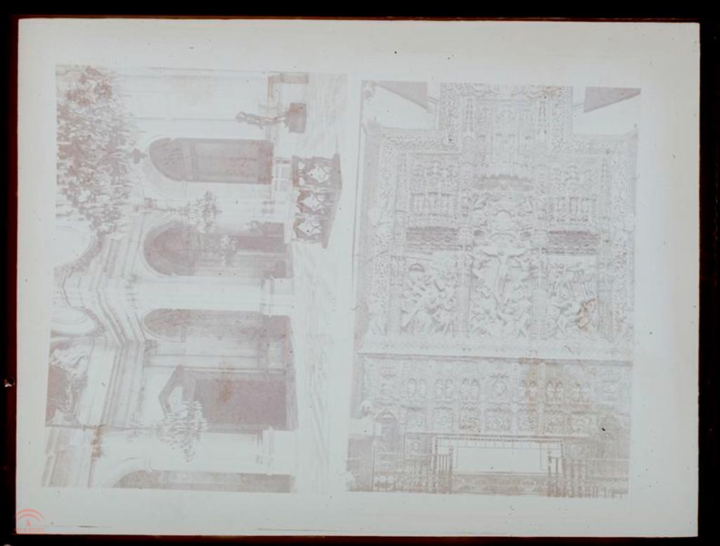 Aparecen dos láminas-fotografías. Cada imagen ocupa una mitad del soporte. La fotografía del Retablo es vertical , y la del Interior de ¿? es horizontal. Valca Universal (Ortocromática Antihalo)