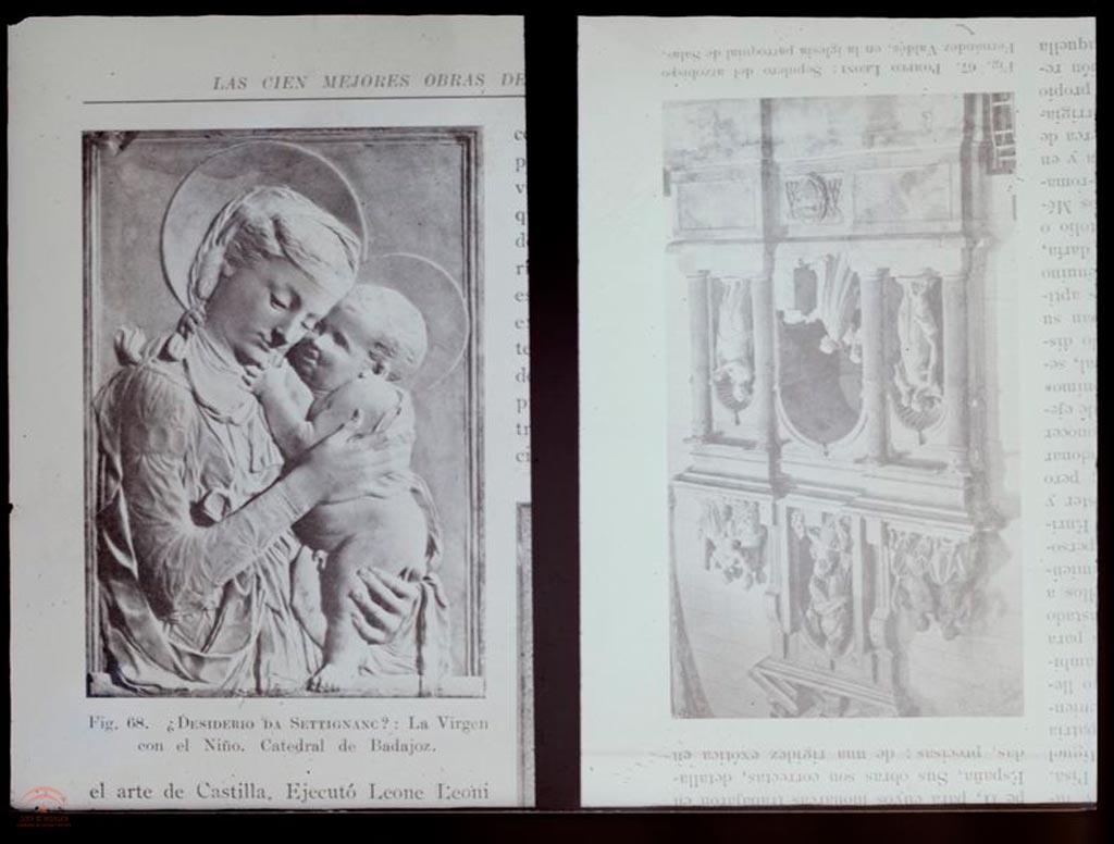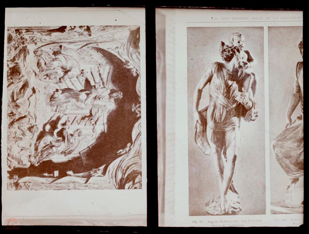 "Aparecen dos láminas-fotografías, pertenecientes a un libro. Cada imagen ocupa una mitad del soporte.En la fotografía de la escultura aparece el título a pié de foto (Esp y Franc).; Valca Universal (Ortocromática Antihalo)"