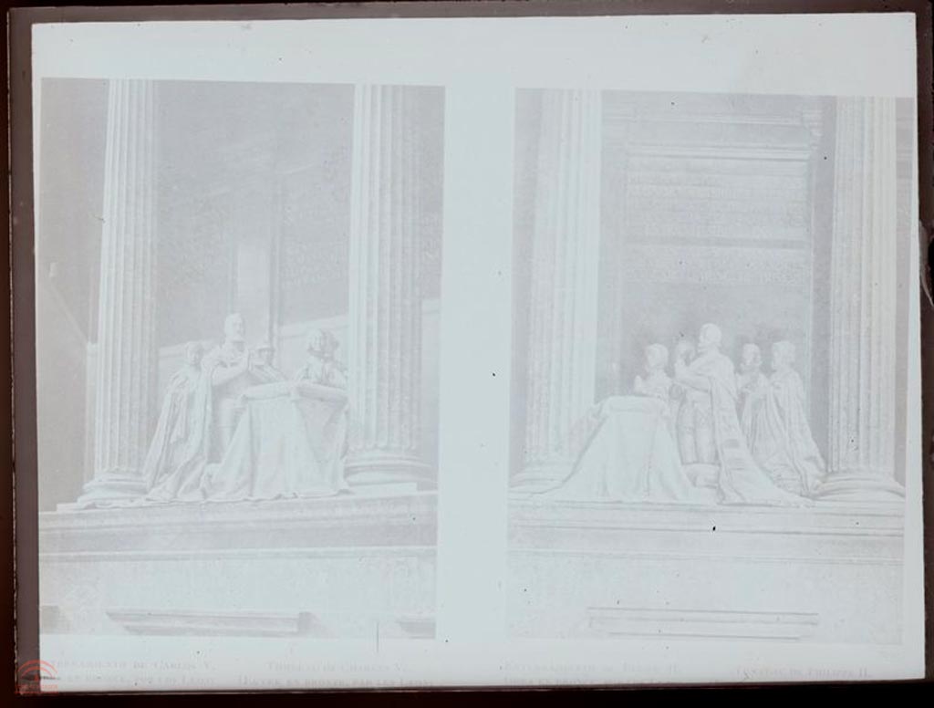 Aparecen dos fotografías de un libro, (Mausoleo de Carlos V : Izqu / Mausoleo de Felipe II: Derecha ) y parte del título de cada imagen a pie de foto. Cada grupo escultórico está flanqueado por columnas. Valca Universal (Ortocromática Antihalo)