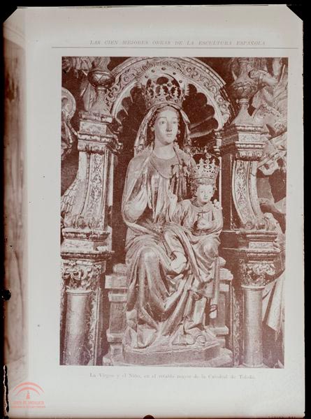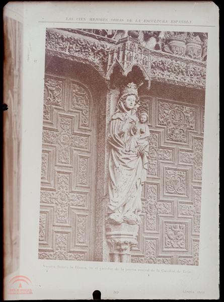 Imagen tomada de un libro, posiblemente para ser usada con fines pedágógicos, Nuestra Señora de la Blanca en el parteluz de la puerta central de la catedral de Toledo