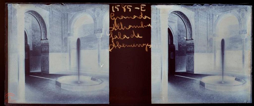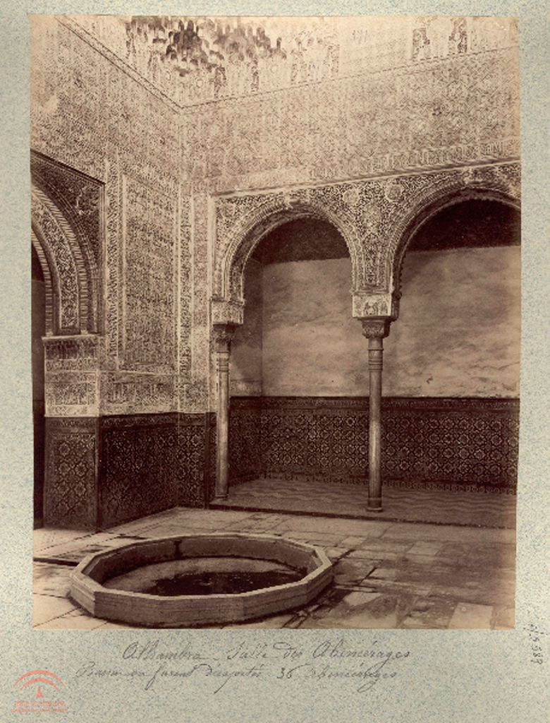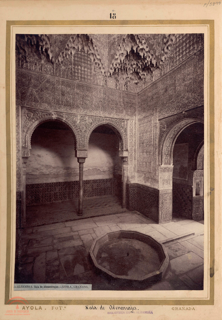1.4.4. En el sello se lee "Biblioteca de la Alhambra". En el titulo de la pegatina se lee "Alhambra. Sala de Abencerrajes. Ayola, Granada".