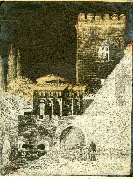 Grabado de la Torre de los Picos, con un pabellón inventado en su baluarte, con escenas domesticas, ropa tendida en tendederos, gallinas, y personajes de época. Vista de la zona de acceso