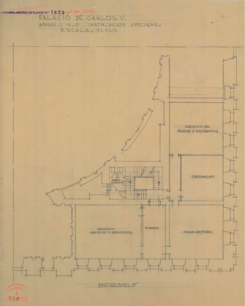 Palacio de Carlos V. Ángulo Suroeste. Planta de entresuelo. Instalación de oficinas