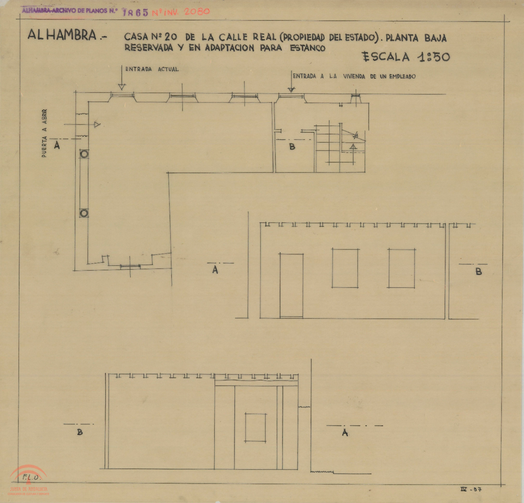 | dc.title | Alhambra. Calle Real nº 20. Casa (propiedad del Estado), reservada y en adaptación para Estanco. Planta baja. Planta y sección | es_ES |