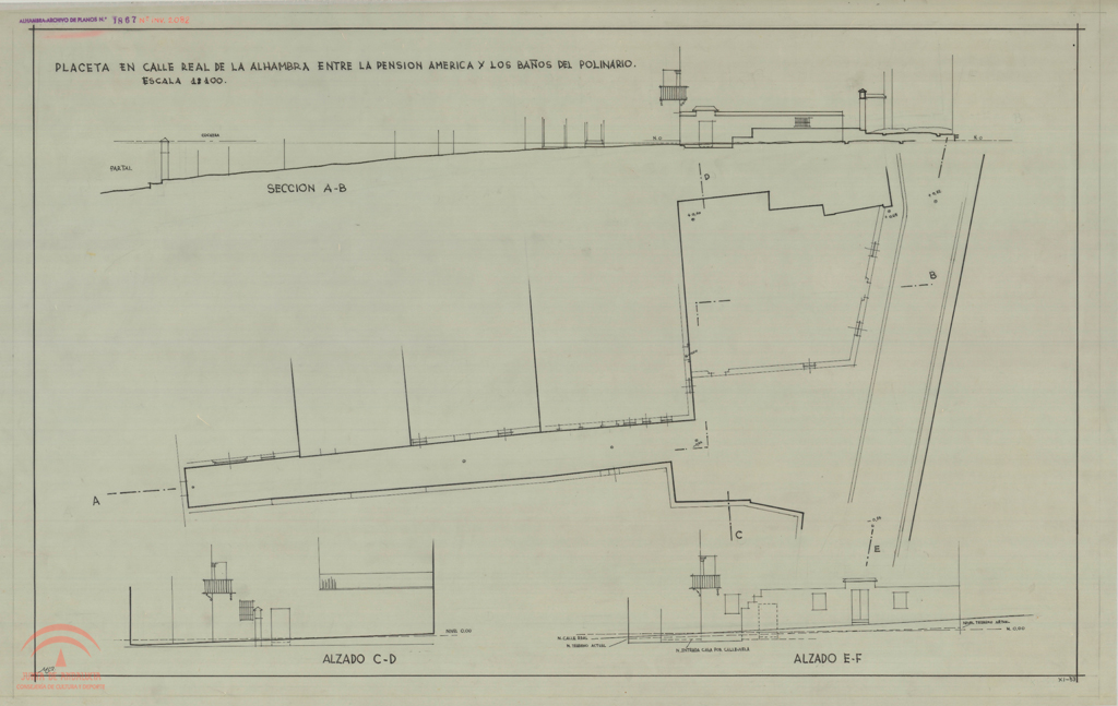 Título: Calle Real de la Alhambra. Placeta entre la Pensión América y los Baños del Polinario (de la Mezquita). Planta, sección A-B y alzados