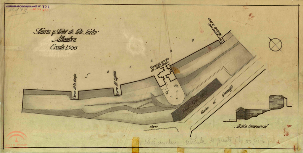 | Resumen: | Alhambra. Huerta y Hotel de Siete Suelos. Planta y sección transversal |