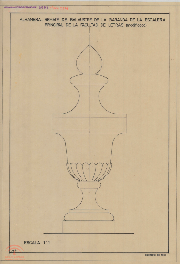 | dc.title | Alhambra. Remate de balaustre de la baranda de la escalera principal de la Facultad de Letras. Alzado | es_ES |