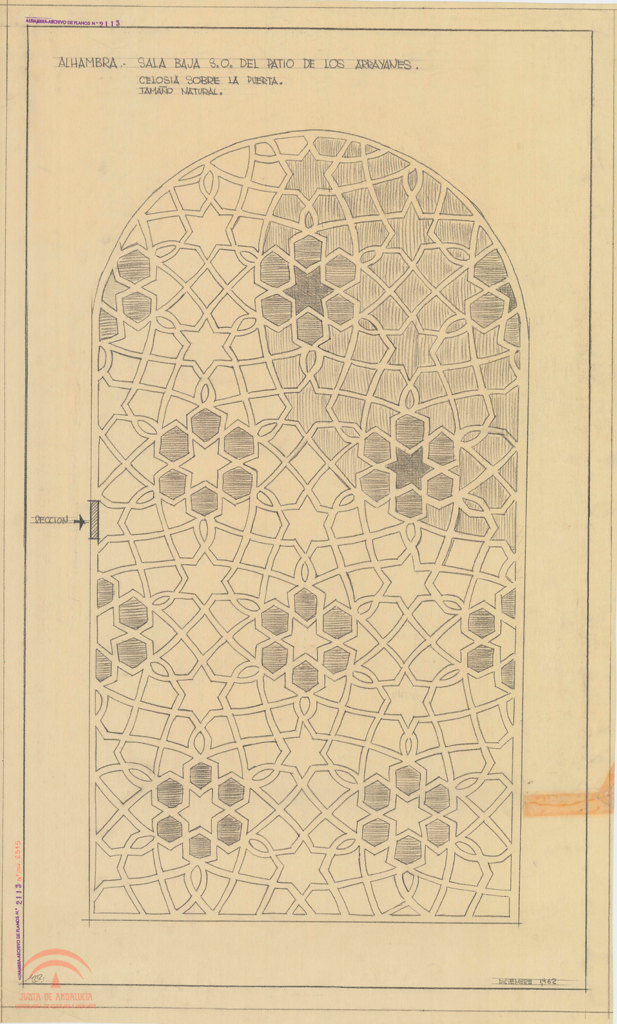 | Título: | Alhambra. Patio de Arrayanes. Sala baja Suroeste. Celosía sobre la puerta. Alzado y sección |