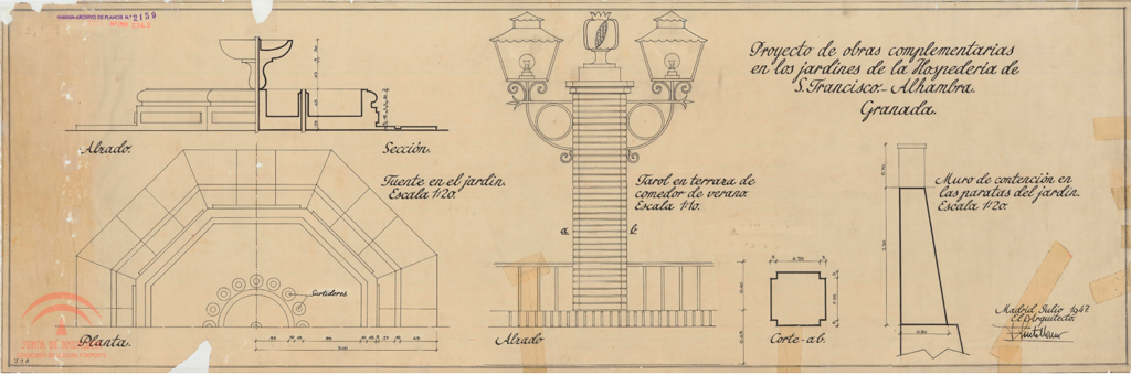 | Título: | Hospedería de San Francisco. Proyecto de obras complementarias en los jardines (fuente y faroles). Planta, alzados y sección |
