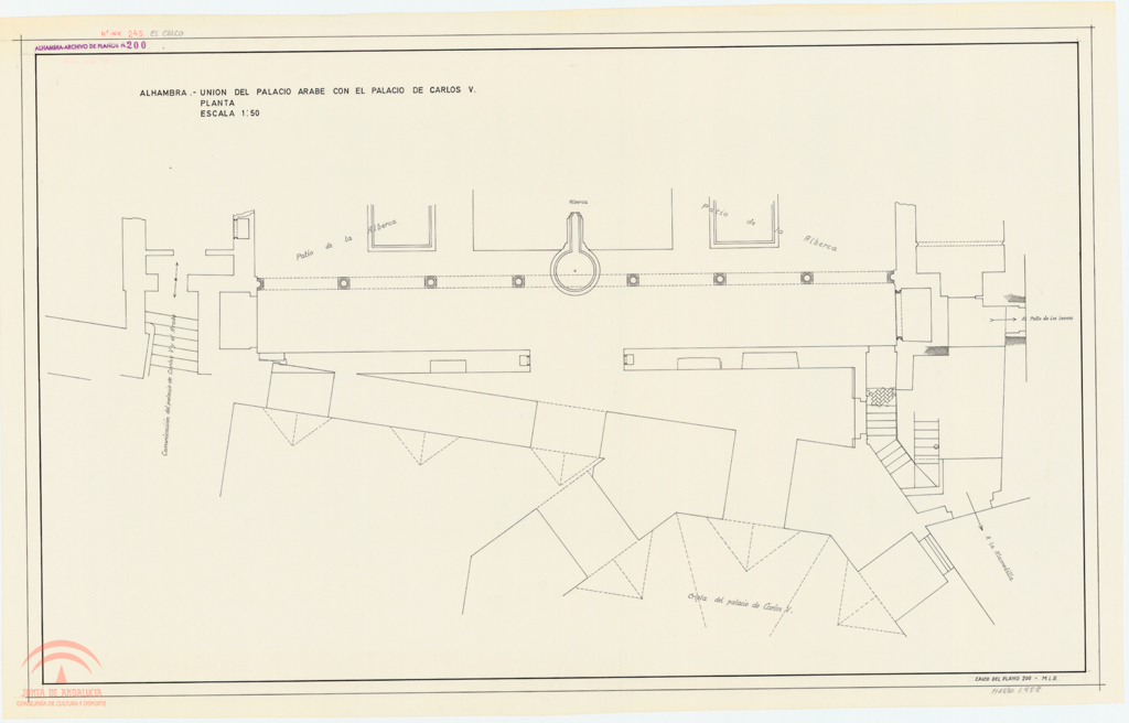 sectores: 2.14.0.5., 2.14.0.6., 2.12.0.0., 5.13.0.0. Numero de plano de la oficina técnica del servicio de conservación: 200, (Alhambra-archivo de planos Nº 200) Digitalizado Calco del antiguo nº 200, actual 243 |