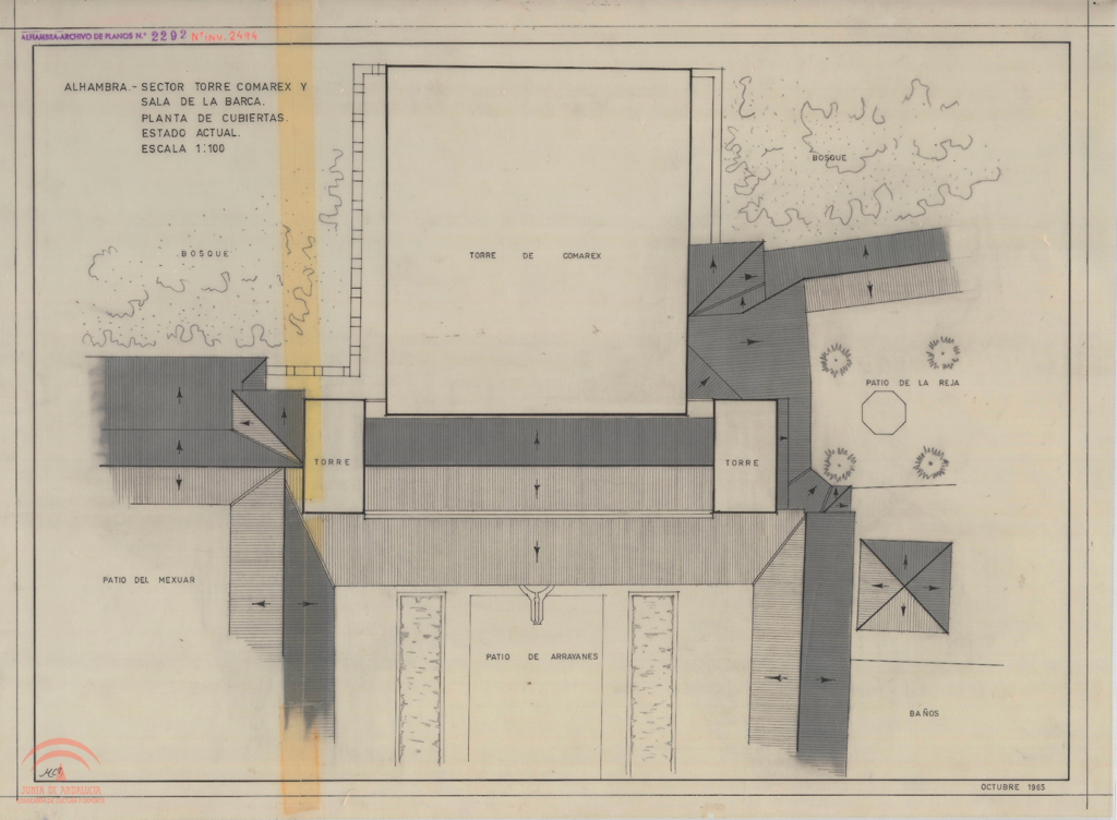 | Título: | Patio de Arrayanes. Sector de la Sala de la Barca y Torre de Comares. Planta de cubiertas. Estado actual |