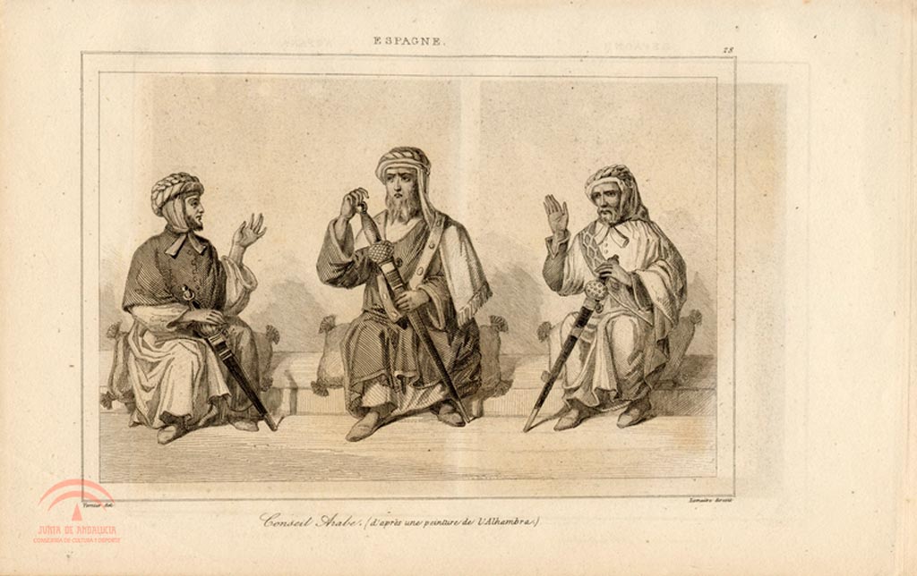 Resumen: "Conseil Arabe (d'après une peinture de l'Alhambra)" (Consejo Árabe, según las pinturas de la Sala de los Reyes);Vernier del[ineavit]. Lemaitre direxit;s.e.