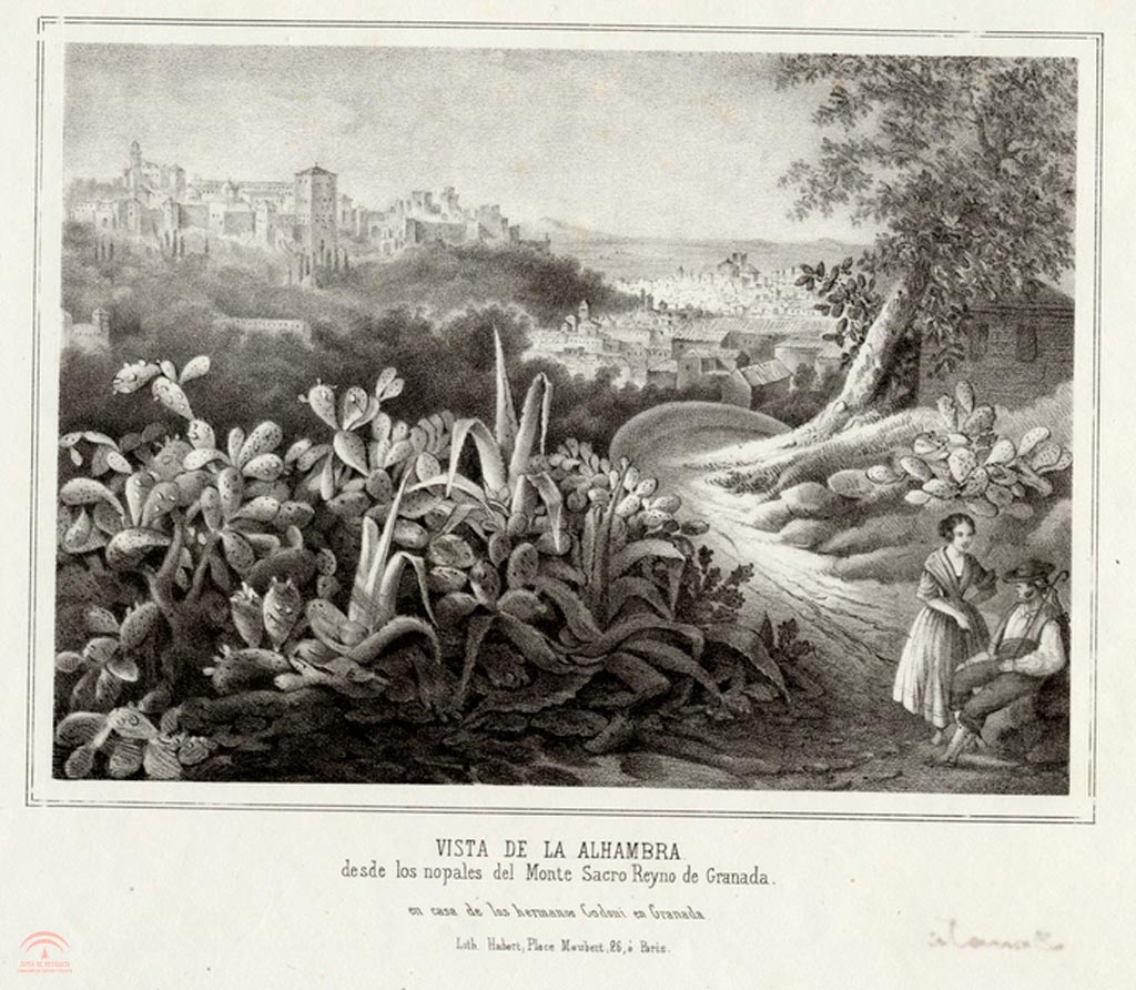 | Título: | "Vista de la Alhambra desde los nopales del Monte Sacro. Reyno de Granada. En casa de los Hermanos Codoni Granada. Lith[ographie]. Habert Paris"" |