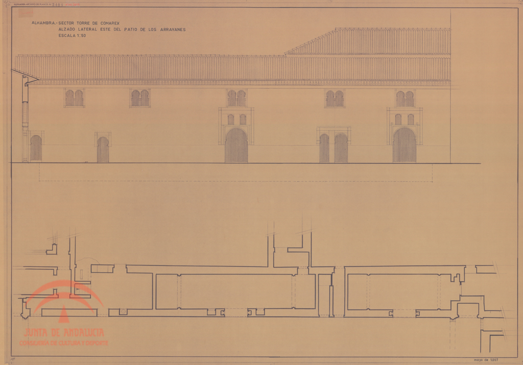 | Título: | Sector Torre de Comares. Alzado lateral Este Patio de Arrayanes. Alzado y planta (1967-may.) |
