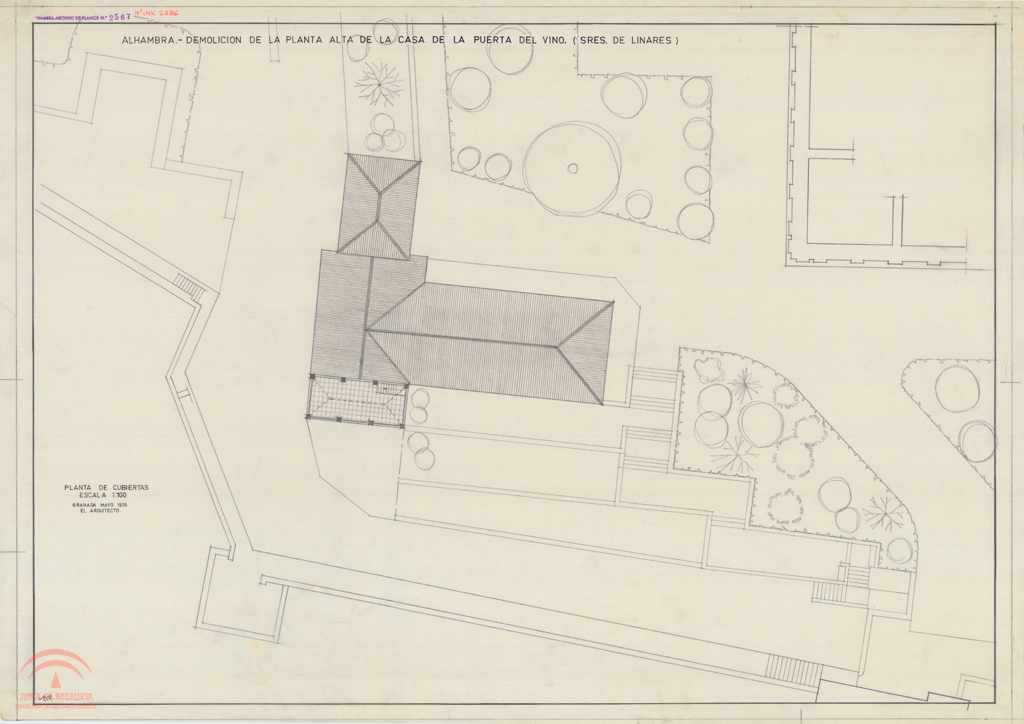 | Título: | Alhambra. Casa de la Puerta del Vino. Demolición de la planta alta (señores de Linares). Planta de cubiertas para el Despacho de Billetes y Casa de Linares |