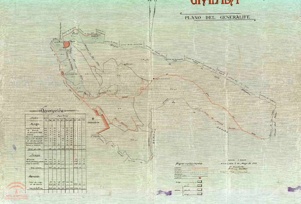 Resumen: Generalife (Palacio y Dehesa). Plano general con descripción de cultivos y superficies de riego