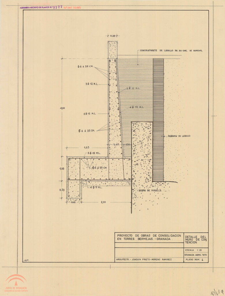 | Título: | Torres Bermejas. Proyecto de obras de consolidación. Plano 4. Muro de contención en el Carmen de San Antonio. Sección |