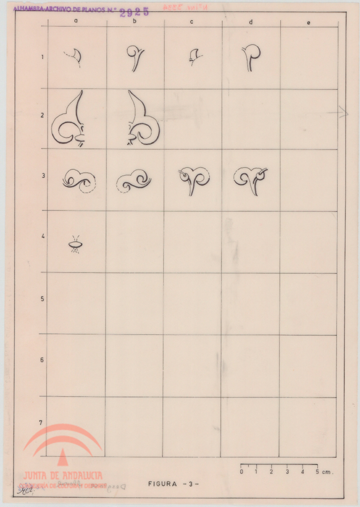 Descripción: Original, Papel vegetal, Tinta, 33 x 23 cm., 1/1, 3.3Antonio Fernández Puertas: "Un paño decorativo de la Torre de las Damas", Cuadernos de la Alhambra, 9, 1973Numero de plano de la oficina técnica del servicio de conservación: 2919, Tomado de una foto