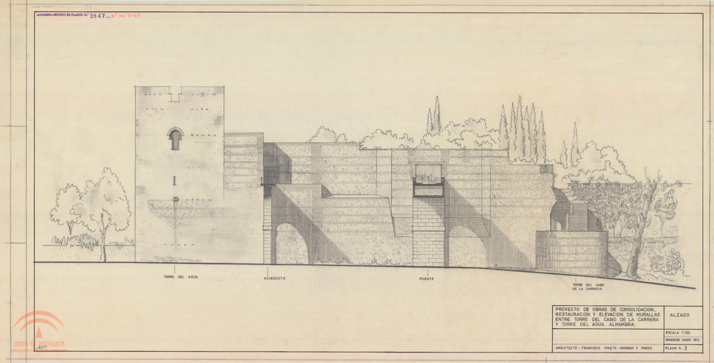 | Título: | Alhambra. Sector de la muralla entre la Torre del Agua y la del Cabo de la Carrera. Proyecto de obras de consolidación y restauración. Alzado |