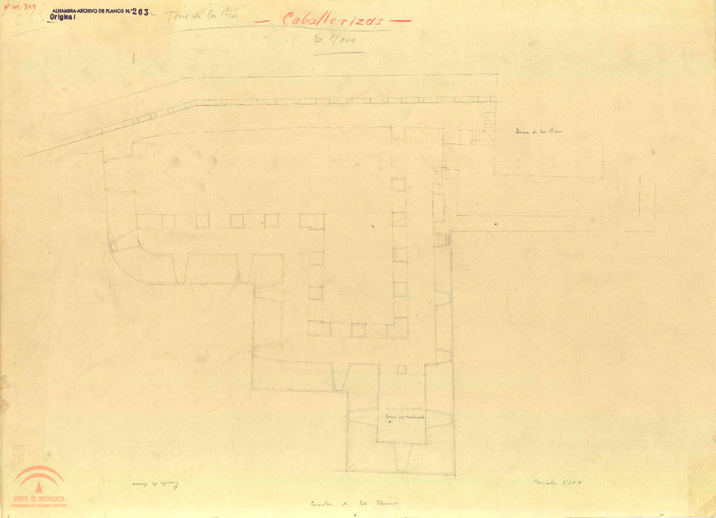 Descripción: Original, cartulina, lápiz, 44x60 cm., 1/100 sectores: 6.10.0.0., 6.9.0.0.Numero de plano de la oficina técnica del servicio de conservación: 263, (Alhambra-archivo de planos Nº 263) Digitalizado