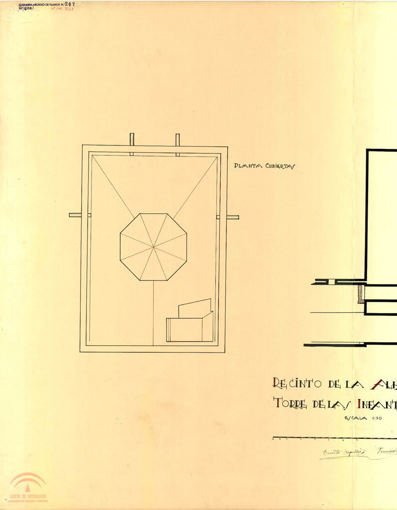 Descripción: DoblezOriginal, cartulina, tinta, 74x103 cm., 1/50 sector: 6.13.0.0.Numero de plano de la oficina técnica del servicio de conservación: 267, (Alhambra-archivo de planos Nº 267) Digitalizado