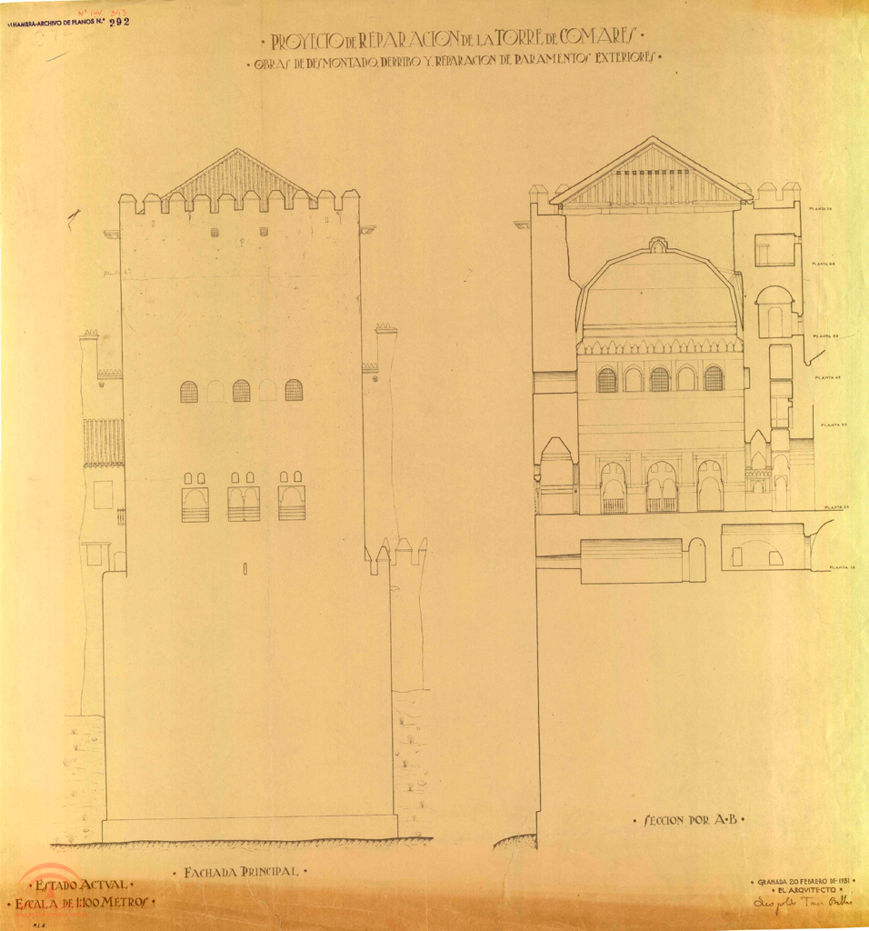 | dc.description.abstract | Torre de Comares. Proyecto de reparación. Obras de desmontado, derribo y reparación de paramentos exteriores. Fachada principal y sección por A-B. Estado actual | es_ES |