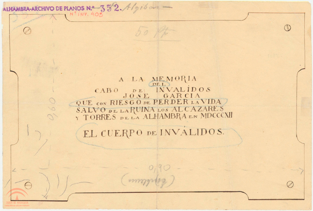 sectores: 4.1.0.0., 4.2.0.0. Numero de plano de la oficina técnica del servicio de conservación: 352, (Alhambra-archivo de planos Nº 352) Digitalizado Con cotas |