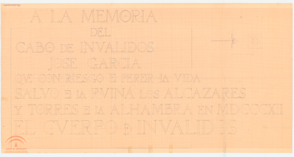 Resumen: Plaza de los Aljibes. Lápida al cabo José García. Alzado y detalles
