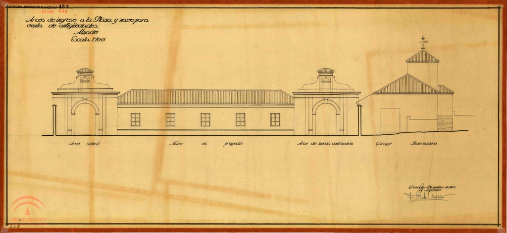| Título: | "Arcos de ingreso en la plaza y nave para venta de antigüedades. Alzado" |