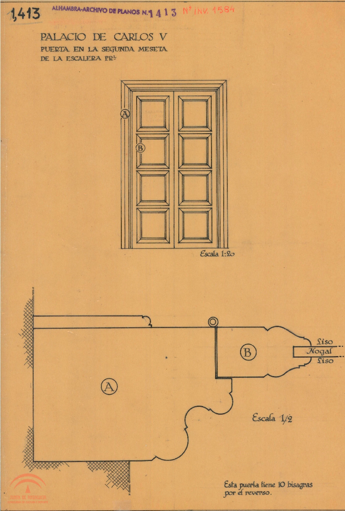 | Título: | Palacio de Carlos V. Carpintería. Puerta de la 2ª meseta de la escalera principal. Alzado y sección |