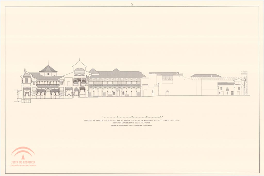 | Título: | Alcázar de Sevilla. Palacio del Rey Don Pedro. Patio de la Montería. Patio y Puerta del León. Sección longitudinal hacia el O (nº 5) |