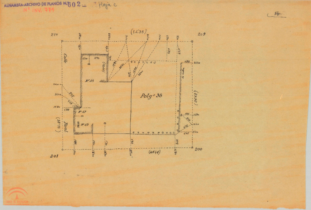 Descripción: Original, papel vegetal, tinta, 22x31 cm., s.e. sector: 24Poligonación Zona Este del Plano General de GranadaNumero de plano de la oficina técnica del servicio de conservación: 602, (Alhambra-archivo de planos Nº 602) Digitalizado