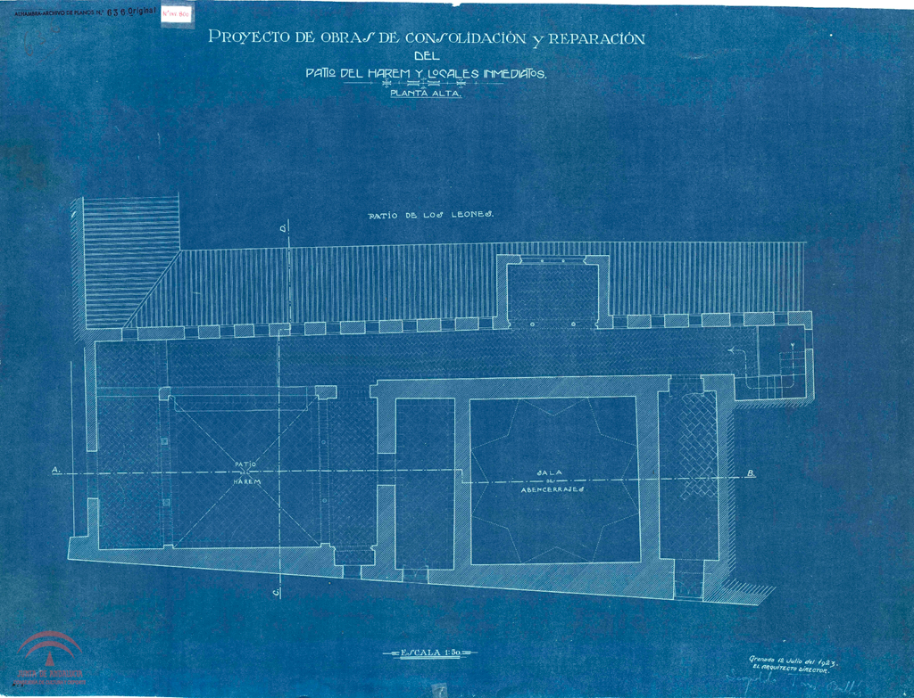 sectores: 2.9.0.0., 2.10.0.0., 2.12.0.0. Número de plano de la oficina técnica del servicio de conservación: 636, (Alhambra-archivo de planos Nº 636) Digitalizado En el original: "Patio del Harem" |