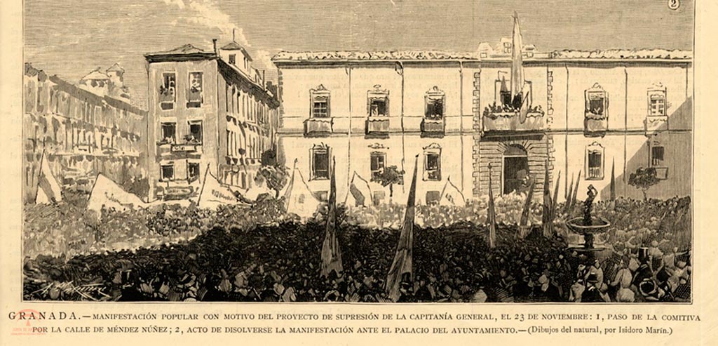 | dc.title | "Granada. Manifestación popular con motivo del proyecto de supresión de la Capitanía General, el 23 de noviembre. 2. Acto de disolverse la manifestación ante el palacio del Ayuntamiento. (dibujos del natural, por Isidoro Marín)" | es_ES |