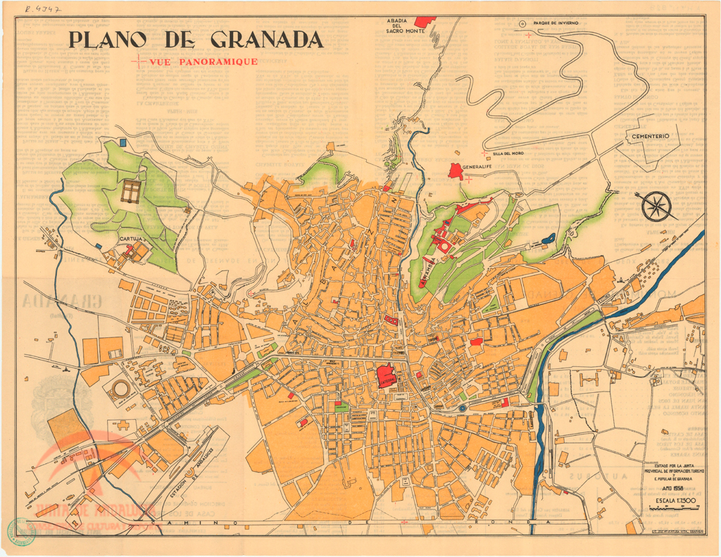 | Resumen: | Plano de Granada. Vue panoramique. Plano de la ciudad con indicación de monumentos y edificios importantes;Editado por la Junta Provincial de Información Turismo y E. Popular de Granada. Lit. José Mª Ventura Hita;1/7.500 |