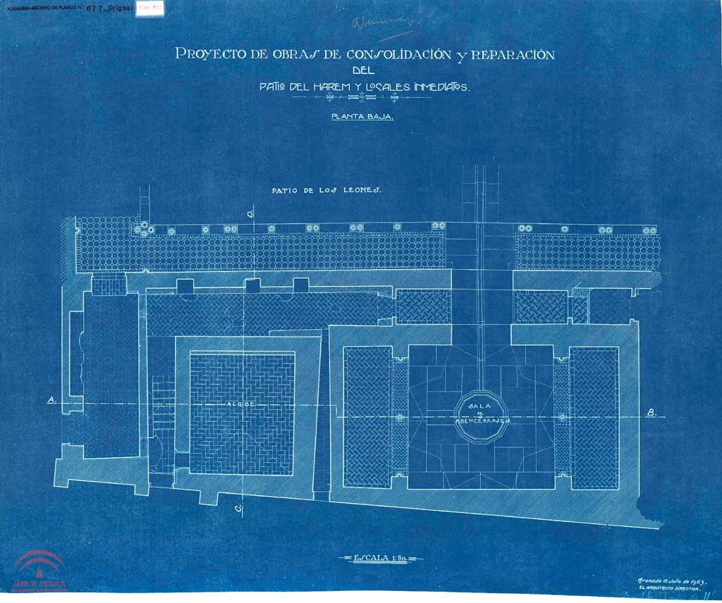 sectores: 2.10.0.0., 2.9.0.0. Número de plano de la oficina técnica del servicio de conservación: 677, (Alhambra-archivo de planos Nº 677) Digitalizado En el original: "Patio del Harem" |
